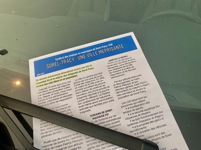En grève générale depuis le 17 mai, les cols bleus sorelois durcissent le ton à l’égard de l’administration Péloquin. Dans un tract distribué en fin de semaine aux passants et aux automobilistes, ils qualifient la Ville de « méprisante » lui reprochant de faire peu de cas des dispositions anti-briseurs de grève – ce que cette dernière a nié – ou de la sécurité des baigneurs lors d’une activité spéciale à la piscine Laurier-R.- Ménard ce dont elle s’est également défendue. L’organisation syndicale accuse le maire Patrick Péloquin et le directeur général Carlo Fleury d’adopter une attitude « désinvolte » et de démontrer du « mépris » à l’égard des cols bleus et de la population.