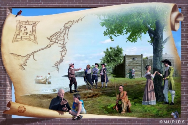 Pour le contenu, l’esquisse de Gilles (Bill) Marcotte a été choisie. Elle propose de situer des personnages historiques sur un fond de vieille carte où un figurant de notre époque assiste au cours d’histoire de Paul Lejeune. Les autres personnages sont Samuel de Champlain, Charles Huault de Montmagny, Paul Lejeune, Alexandre de Prouville, marquis de Tracy, Pierre De Saurel, Catherine Legardeur ainsi que des Amérindiens.