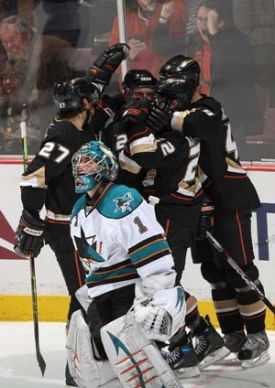 Greiss a effectué 25 arrêts devant le filet des Sharks, qui avaient remporté leurs 10 derniers matchs à l’étranger. Jean-Sébastien Giguère a quant à lui arrêté 29 des 29 rondelles dirigées contre lui. Todd Bertuzzi et Corey Perry ont marqué les autres filets des Ducks. Jeremy Roenick a marqué un but et récolté un aide dans la défaite.