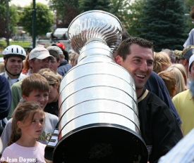 Ensuite, on a demandé à Pierre Mondou, qui fut le dernier avant François Beauchemin à remporter le précieux trophée, de faire la passation de la Coupe à Beauchemin. Puis, après quelques entrevues avec les médias, François Beauchemin s’est tapé un méga bain de foule. Entre 500 et 700 personnes formaient une longue la file afin d’obtenir un autographe ou une photo avec le # 23 et la Coupe Stanley. D’ailleurs, certaines personnes attendaient là depuis 7h00, le matin de l’événement. De plus, tous les profits de cette journée iront à la Fondation de l’hôpital pour enfants Sainte-Justine, et c’est François Beauchemin lui-même qui s’y rendra lundi matin afin de remettre le chèque à la Fondation et de présenter la Coupe aux enfants malades.