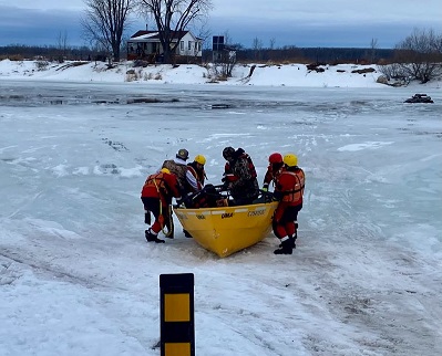 En après-midi samedi, c’était au tour d’un appel pour un sauvetage nautique de retentir après qu’un véhicule amphibie de type Argo se soit enlisé dans les glaces du Chenal du Moine. Les deux personnes à bord accompagnées de leur chien ont attendu calmement l’arrivée des pompiers. Monsieur Poirier :