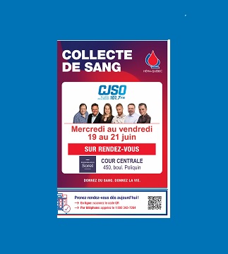 Les résidents de Sorel-Tracy et région sont invités à prendre part à la Collecte de sang de CJSO la semaine prochaine. Elle se tiendra aux Promenades de Sorel aux jours et heures suivants : le mercredi 19 juin de 10h à 16h, puis les jeudi 20 et vendredi 21 juin de 13h30 à 19h30. L’objectif de cette collecte est de 180 donneurs. Josée Larivière d’Héma-Québec:
