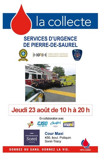 Organisée par les policiers, les pompiers et les ambulanciers de Sorel-Tracy, en collaboration avec les Promenades de Sorel, les Filles d’Isabelle du Cercle Ève-Marie, CJSO 101,7 FM, la Laiterie Chalifoux et Maxi, la collecte de sang des services d’urgence aura lieu le jeudi 23 août, entre 10 h et 20 h, à la cour Maxi des Promenades de Sorel, situées au 450, boul. Poliquin.