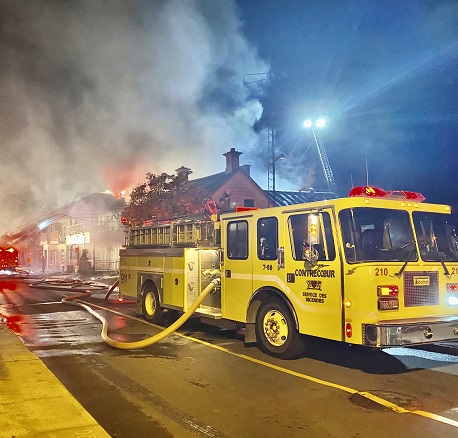 Le Bailey’s Resto-Bar, un établissement de la rue Saint-Antoine à Contrecoeur, est à nouveau la cible d’un incendie. Le feu a pris naissance au milieu de la nuit comme ce fut cas le 30 septembre dernier. C’est un voisin qui a alerté les pompiers après avoir entendu le bruit d’une fenêtre fracassée et aperçu de la fumée. Les propriétaires qui habitent la maison voisine laquelle est attachée au bâtiment assistent impuissants à la scène. Les pompiers de Contrecoeur sont appuyés par leurs collègues de Sorel-Tracy, Saint-Roch-de-Richelieu et Saint-Antoine-sur-Richelieu. Personne n’a été blessé. La Régie intermunicipale de police Richelieu-Saint-Laurent mènera enquête. Le directeur du Service des incendies de Contrecoeur, Bruno Isabelle :