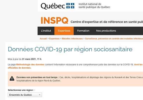 Le nombre de cas de COVID-19 est à la hausse depuis la semaine du 21 mars en Montérégie. Il a augmenté dans tous les groupes d’âge sauf chez les personnes de 70 ans et plus. Il est demeuré relativement stable dans 7 MRC et a augmenté dans 6 MRC. Le nombre d’hospitalisations est relativement stable depuis 4 semaines, comme l’est celui des décès depuis 3 semaines. À ce jour, 3,4 % des Montérégiens qui ont eu la COVID-19 en sont décédés. La moyenne d’âge des personnes décédées est de 84 ans. Il y a aujourd’hui, 31 mars, 8 cas actifs sur le territoire du Réseau local de services Pierre-De Saurel. C’est, avec 15,6 cas par 100 000 habitants, le territoire le moins affecté de la Montérégie, le plus affecté étant celui du Réseau local de services de Champlain avec 81,4 cas par 100 000 habitants, suivi de Richelieu-Yamaska avec 80,2 cas et de Pierre-Boucher avec 80 cas par 100 000. En Montérégie, près de 184 000 personnes ont été à ce jour vaccinées contre la COVID-19.