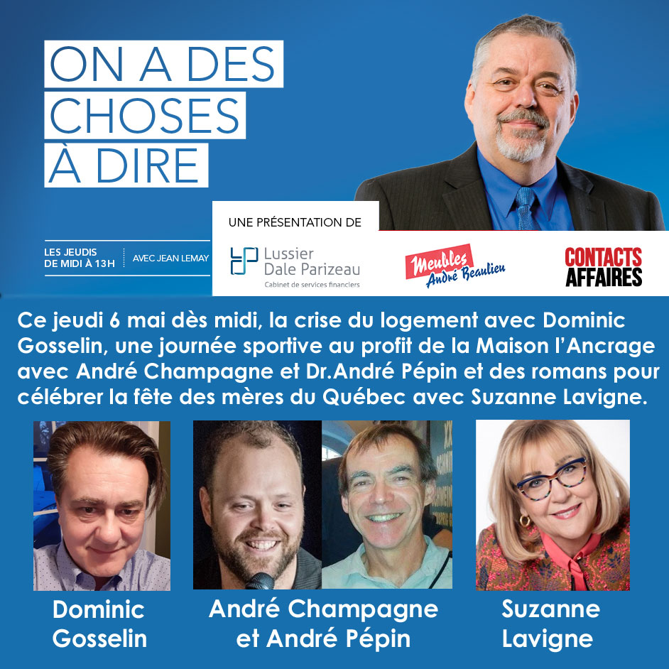 La crise du logement avec Dominic Gosselin, une journée d’activités sportives au profit de la Maison L’Ancrage avec André Champagne et André Pépin et deux romans auto-biographiques qui rendent hommage aux mères du Québec avec Suzanne Lavigne.