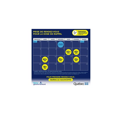 Les dates d’ouverture de prise de rendez-vous pour la dose de rappel du vaccin contre la COVID-19 ont été devancées pour chaque groupe d’âge. Il est ainsi possible pour les 50 ans et plus de prendre rendez-vous dès aujourd’hui jeudi. Ce sera, demain, vendredi, possible de le faire pour les 45 ans et plus, lundi 10 janvier pour les 40 ans et plus, mercredi 12 pour les 35 ans et plus, vendredi 14 pour les 25 ans et plus et, le lundi 17 janvier, pour les 18 ans et plus. Il suffit, pour réserver sa place, de se rendre sur Québec.ca/vaccinCOVID ou de composer, sans frais, le 1 877 644‑4545.