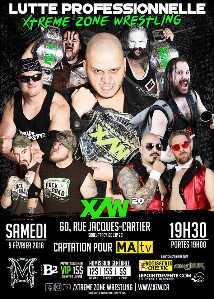 Samedi, le 9 février prochain, la fédération de lutte de Sorel-Tracy, la XZW présente le gala XZW 20, à 19 heures 30 à la Salle des Chevaliers de Colomb (60, rue Jacques-Cartier) à Sorel-Tracy.