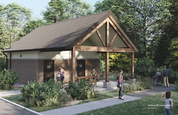 Le nouveau chalet comprendra notamment des locaux de rangement et deux salles de toilettes, dont l’une sera adaptée aux besoins des personnes à mobilité réduite. Le nouveau pavillon sera également muni d’une station de remplissage pour les bouteilles d’eau, d’une sortie d’eau extérieure et de tables à pique-nique. Des sentiers seront aménagés autour du chalet afin de faciliter l’accès à celui-ci.