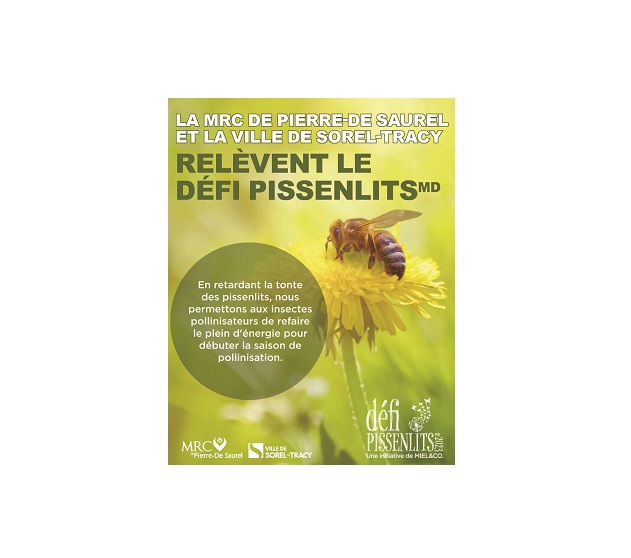 La Ville de Sorel-Tracy et la MRC de Pierre-De Saurel participeront de nouveau au Défi pissenlits, un mouvement de sensibilisation à l’importance des insectes pollinisateurs. Le défi est simple : laisser pousser les pissenlits sur votre terrain durant le mois de mai. Plutôt que de tondre ou de pulvériser ces fleurs, on les offre aux insectes pollinisateurs, comme les abeilles, qui pourront se refaire des forces grâce aux grandes quantités de pollen et nectar qu’offrent les pissenlits. Tous les citoyens sont donc invités à relever ce défi!