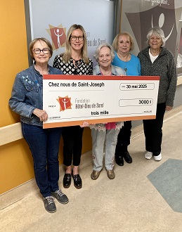 La Fondation Hôtel-Dieu de Sorel remercie l’organisme « Chez nous de Saint-Joseph » pour son généreux don de 3000 $ récolté grâce à une série d’activités de financement organisées tout au long de l’année. Cet appui financier concourra, avec d’autres, au maintien de services de qualité à l’Hôtel-Dieu de Sorel, au CLSC Gaston-Bélanger, aux Centres d’Hébergement et de Soins de Longue Durée ainsi qu’à l’unité de soins palliatifs Myosotis.