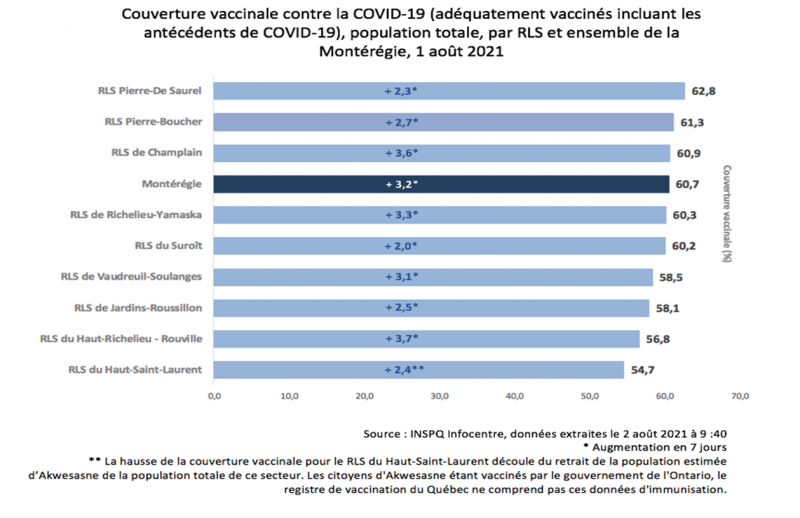 La région de Pierre-De-Saurel demeure toujours au premier rang au niveau du pourcentage de gens complètements vaccinés avec un taux de 62.8 %.