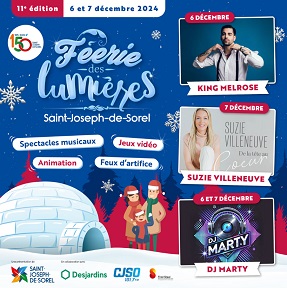 C’est en fin de semaine, vendredi et samedi, que nous donne rendez-vous la 11e édition de la Féerie des lumières. Elle marquera le lancement des festivités du 150e anniversaire de la Ville de Saint-Joseph-de-Sorel. Une animation soulignera cet anniversaire sur scène, vendredi, de19h30 à 19h45.