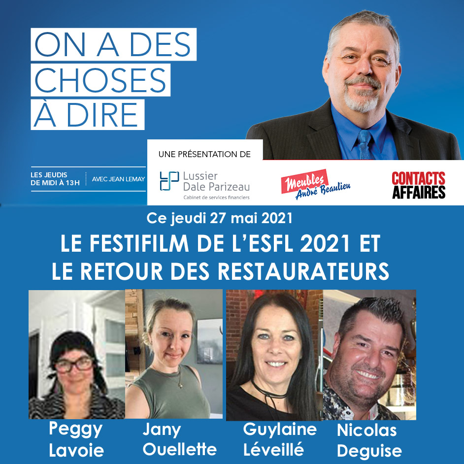 Ce jeudi on vous annonce le retour du Festifilm de l’école secondaire Fernand Lefebvre, Peggy Lavoie et Jany Ouellette nous parle de cette 5e édition conçue dans des conditions très particulières. Deux restaurateurs ont acceptés de venir nous parler du retour graduel de la restauration dans la région avec les annonces du premier ministre la semaine dernière soit Guylaine Léveillé du Cactus Café et Nicolas Deguise du Resto-bar 525.
