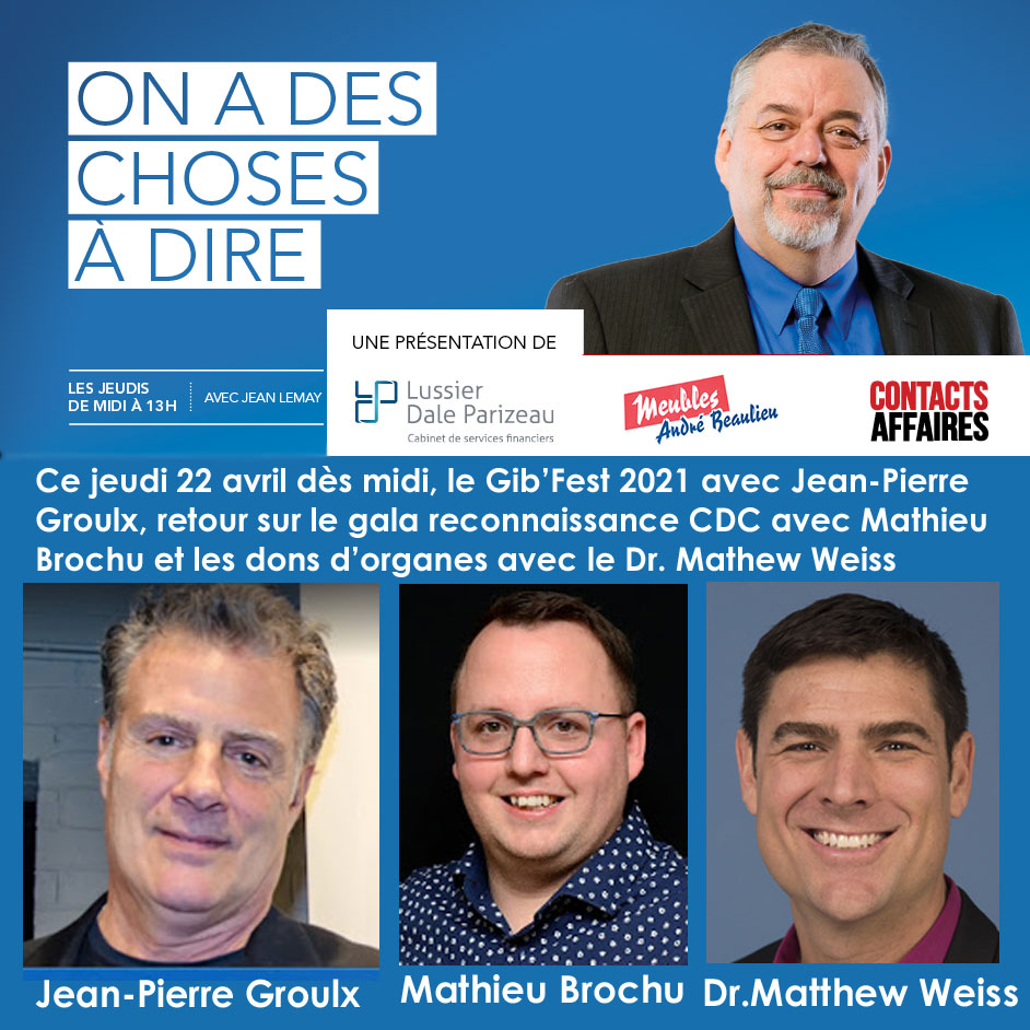 On s’informe sur la prochaine édition du Gib’Fest avec son président Jean-Pierre Groulx, on revient sur le gala reconnaissance del a CDC avec Mathieu Brochu et on souligne la semaine du dons d’organes avec le Dr. Matthew Weiss.
