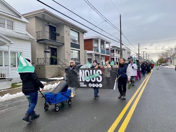 La grève des employés du secteur public a donné lieu ce matin à une nouvelle démonstration de solidarité. Des syndiqués du secteur de l’éducation qui faisaient du piquetage devant les bureaux du Centre de services scolaire de Sorel-Tracy ont pris la rue pour se diriger vers l’Hôtel-Dieu de Sorel. L’imposante marche a grossi les rangs des manifestants déjà nombreux devant l’hôpital, la FIQ s’étant jointe aujourd’hui au mouvement de grève. Micheline Charron de la CSN:
