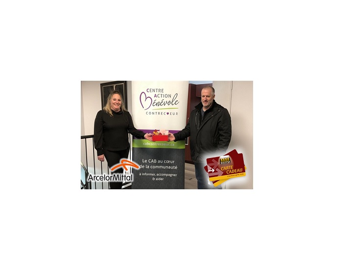 Le Centre d’action bénévole de Contrecœur exprime sa reconnaissance aux employés et aux cadres de l’usine de Contrecœur-Ouest d’ArcelorMittal de même qu’au Cinéma St-Laurent de Sorel-Tracy qui ont participé au don de cartes cadeaux d’une valeur de plus de 2 000$ aux familles fragilisées économiquement de la localité.