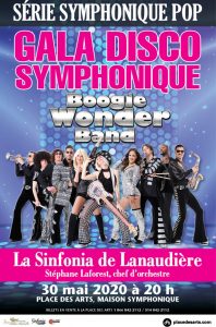 Le Gala disco symphonique mettant en scène le groupe disco Bougie Wonder Band et l’orchestre La Sinfonia de Lanaudière qui sera dirigé par le Maestre Stéphane Laforest à la Maison Symphonique de Montréal le 30 mai 2020.