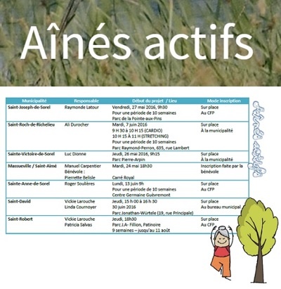 Aînés actifs a pour objectif premier de faire bouger les gens dans leur milieu de vie en bonifiant l’offre d’activités en place sur le territoire, mais pendant la période estivale puisque les activités déjà offertes le sont de septembre à mai. Le Centre de formation professionnelle de Sorel-Tracy offre les activités qui sont animées par des professionnels. Parmi celles proposées on retrouve le Taï-chi, le yoga doux, la gymnastique douce, pilates, Qi Gong, marche et étirements et Zumba.