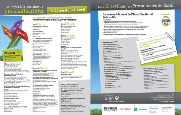 Parmi les activités proposées on retrouve le rassemblement de l’Écocollectivité, le jeudi, 30 avril de 16h à 21h, aux Promenades de Sorel. Sur place, NathB photographe, fera un photomaton qui mènera à une œuvre collective sur la conception du développement durable. Aussi, les visiteurs pourront suivre des ateliers sur le compostage domestique et l’herbicyclage, donnés par la MRC de Pierre-De Saurel. Le FM 101,7 y sera aussi, avec une émission en direct, coanimée par Jean Lemay et des jeunes de l’émission Tassez-vous de d’là, de 16h à 18h.