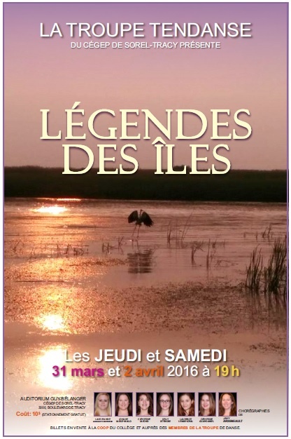 La troupe Tendanse du Cégep de Sorel-Tracy présentera LÉGENDES des îles, leur spectacle annuel, le jeudi 31 mars et le samedi 2 avril prochains à l’auditorium Guy-Bélanger du Cégep.