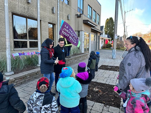 Saint-Joseph-de-Sorel a profité de la Journée mondiale de l’enfance, lundi, pour hisser le drapeau de la Grande semaine des tout-petits. Le maire Deguise l’a fait accompagné d’enfants du service de garde de l’école Martel. Ces jeunes citoyennes et citoyens ont aussi affiché les drapeaux qu’ils ont eux-mêmes confectionnés et portaient tous fièrement leur carré-doudou.