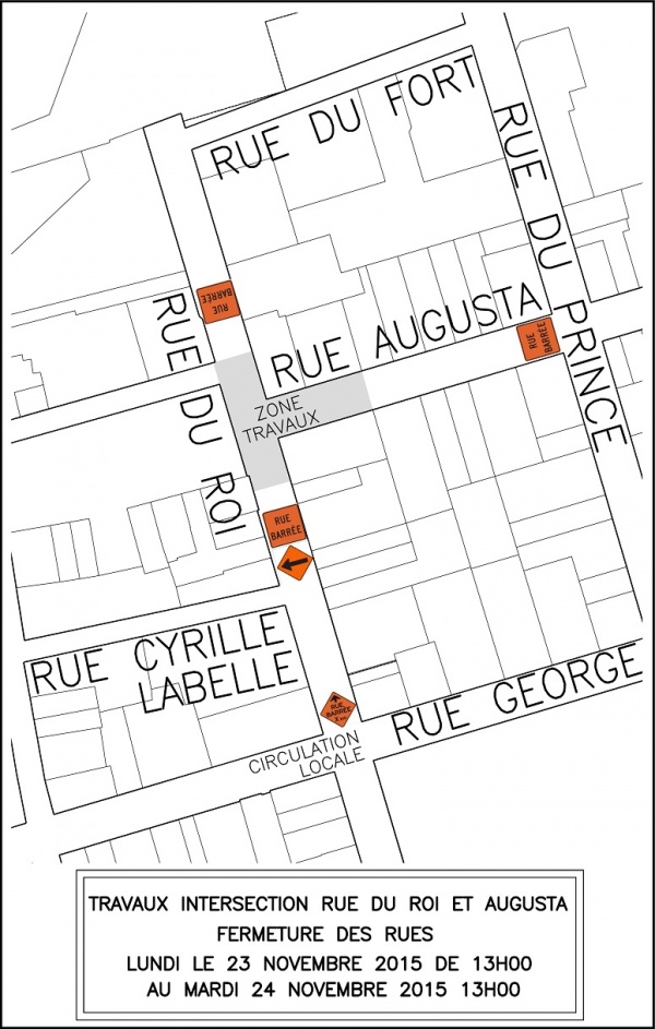 Ces travaux, effectués en collaboration avec l’entreprise Danis Construction, occasionneront la fermeture complète de la rue du Roi (de la rue George à la rue du Fort) et de la rue Augusta (de la rue du Roi à la rue du Prince) du lundi, 23 novembre à 13h au mardi, 24 novembre à 13h.
