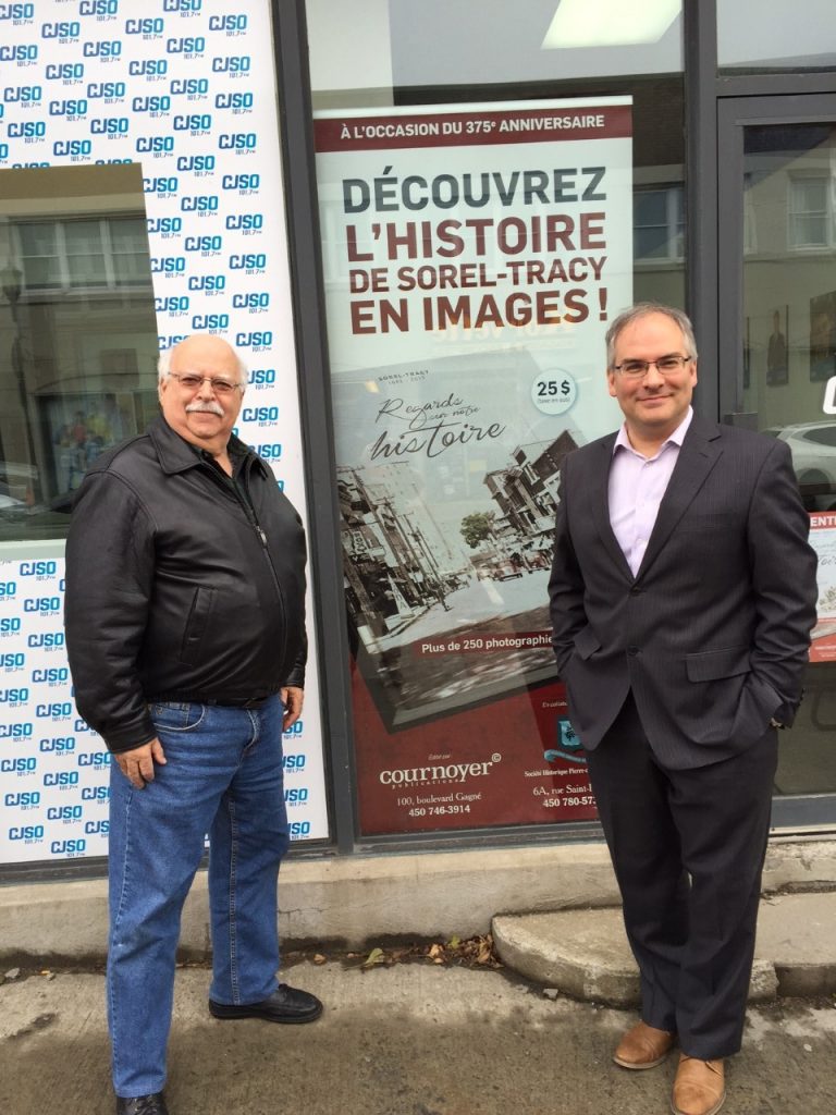 Le président de Cournoyer communications et marketing  Laurent Cournoyer et Luc Poirier ,président de la Société historique Pierre-de -Saurel nous parlent avec fierté du livre