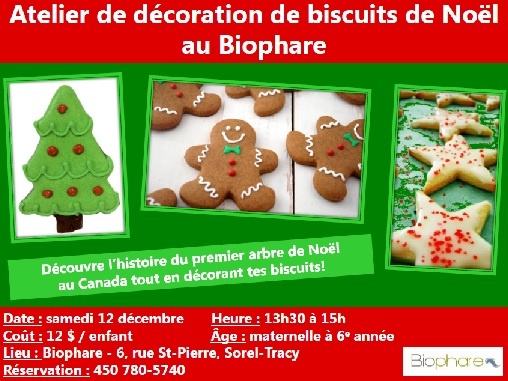 Le Biophare offre aux enfants de la maternelle à la sixième année du primaire un atelier de décoration de biscuits de Noël, le samedi, 12 décembre prochain, de 13h30 à 15h. Un atelier supplémentaire a été prévu le matin, de 10h00 à 11h30, en raison du nombre élevé de demandes.