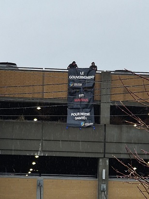 Trois organisations syndicales déroulaient, près de l’Hôpital Charles-Lemoyne, lundi, une banderole sur laquelle on pouvait lire « Le gouvernement est mauvais pour notre santé ».