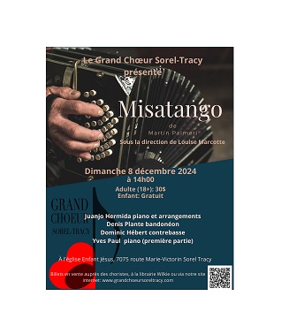 Le Grand Chœur Sorel-Tracy dirigé par la soprano Louise Marcotte nous convie à un concert exceptionnel, le 8 décembre prochain, à 14h, en l’église Enfant-Jésus du secteur Tracy. Ce concert mettra en vedette une œuvre sacrée sous forme de tango. Elle s’intitule La Misa a Buenos Aires. Le compositeur argentin Martin Lammeri l’a signée. Le Chœur sera pour l’occasion accompagné par d’excellents musiciens de tango dont Juanjo Hermida pianiste argentin d’un talent exceptionnel qui habite maintenant notre région, ainsi que le réputé bandonéoniste Denis Plante, sans oublier le contrebassiste Dominic Hébert. En première partie de son spectacle, le Grand Chœur Sorel-Tracy interprétera des chants de Noël accompagné au piano par Yves Paul pianiste et arrangeur du choeur. Les billets, au coût de 30$, sont en vente à la Librairie Wilkie ainsi qu’auprès des choristes et sur le site WEB de l’ensemble vocal www.grandchoeursoreltracy.com