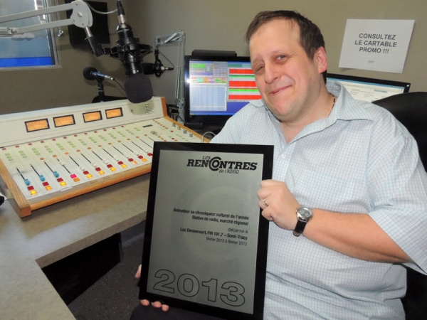 À sa deuxième participation au Gala 2013 des Rencontres de l’Association québécoise de l’industrie du disque, du spectacle et de la vidéo (ADISQ), tenu hier soir au Marché Bonsecours, à Montréal, notre collègue Luc Denoncourt a été nommé ’’Animateur ou chroniqueur culturel de l’année, marché de la radio régionale.’’.