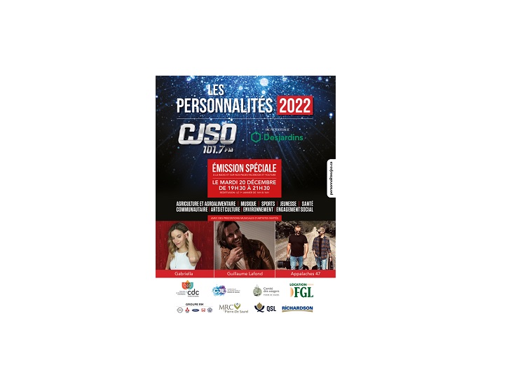 CJSO 101,7 FM annonce le retour, pour une septième année consécutive, de son émission gala « Les Personnalités 2022 CJSO » dont les Soreloises et les Sorelois qui se sont particulièrement distingués au cours de l’année dans leur domaine d’activité respectif, seront les vedettes.