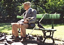 des pigeons viennent manger dans la main d’un vieil homme assis sur un banc