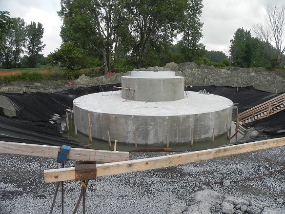Selon Frédéric Tremblay, directeur général du Parc, quatre fondations sont maintenant terminées et quelques autres seront finalisées au cours des prochains jours. Une grande partie des câbles est enfouie le long des chemins et le poste de sectionnement et d’appareillage est présentement installé. Au cours des prochaines semaines, les travailleurs vont s’affairer à terminer les fondations pour recevoir les éoliennes. Il s’agit de la partie la plus laborieuse des travaux puisque des pieux d’une profondeur d’environ 100 pieds doivent être installés, puis il faut procéder à la réalisation de bases de béton armé, contenant environ 40 tonnes d’armature dans chacune d’elle. Selon Jocelyn Bernier, une bétonneuse entre sur le chantier toutes les 15 minutes, et pour réaliser le bétonnage d’une base, dix bétonneuses doivent se relayer sur la route. Pour ce qui est des éoliennes en tant que tel, les nacelles entreront en production en Allemagne la semaine prochaine, les pales sont déjà réalisées et les pièces de la tour seront faites aussi bientôt. Toutes les pièces devraient être terminées pour le 12 août, et par la suite, elles seront envoyées par bateau jusqu’à Bécancour, pour être ensuite acheminées sur le chantier par camion. L’étape de montage des éoliennes prendra environ 10 semaines, à raison d’environ une éolienne érigée à tous les trois ou quatre jours. Le montage nécessitera sur le chantier la présence de deux des plus grosses grues au Québec, qui ont une faible tolérance aux grands vents. Une fois assemblées les éoliennes mesureront 100m, avec un 46m supplémentaire avec les pâles.