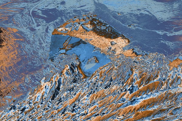 Neuf ans plus tard, il revisite les photographies aériennes de son voyage pour en relever, en couleurs, la perspective bien réelle de fonte des glaciers. Sur les images, peintes à l’aide d’outils numériques, les couleurs chaudes symbolisent la glace fondante, tandis que le bleu suggère l’eau, à l’état liquide, comme si une caméra infrarouge était plongée au cœur des glaciers.