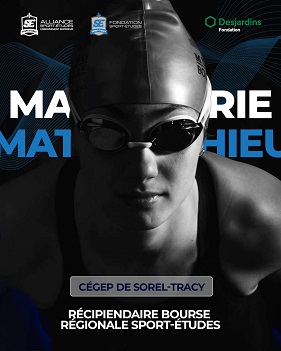 Marie Mathieu est la lauréate, pour le Cégep de Sorel-Tracy, de la bourse sport-études de 500 $ de la Fondation Desjardins. La nageuse s’est fait remarquer au collégial comme une étudiante-athlète exemplaire qui est équilibrée dans sa vie, qui gère bien son stress et qui est toujours de bonne humeur.