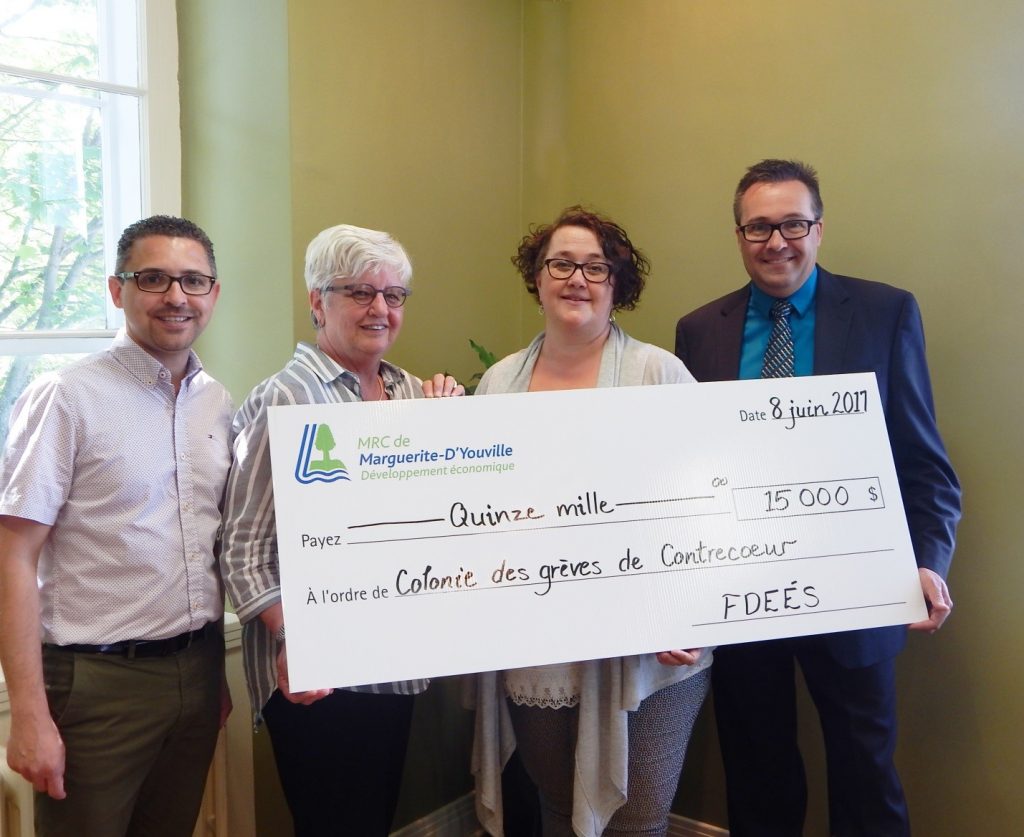 Légende photo : Mme Nancy-Annie Léveillée, directrice générale de la Colonie des Grèves de Contrecœur (2e de la droite) entourée de M. Mathieu Noraz, conseiller aux entreprises, du Service de développement économique de la MRC de Marguerite-D’Youville, Mme Suzanne Dansereau, préfet de la MRC de Marguerite-D’Youville et mairesse de Contrecœur, et de M. Sylvain Berthiaume, directeur général de la MRC de Marguerite-D’Youville.