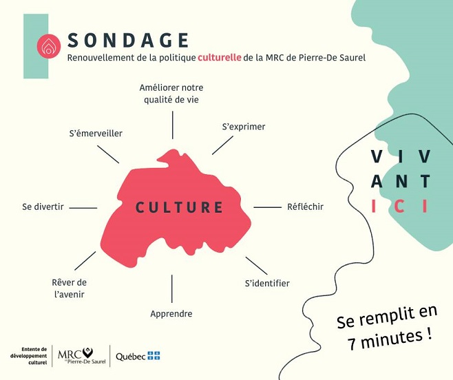 La MRC de Pierre-De Saurel invite les citoyens de son territoire à compléter un sondage en ligne sur leurs habitudes, leurs besoins et leurs idées en matière de consommation culturelle. Le sondage comporte vingt questions et requiert en moyenne sept minutes pour y répondre.