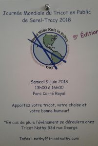 Nathaly Lacasse nous parle de la Journée mondiale du tricot en public qui sera célébrée le samedi 9 juin prochain, au carré Royal de Sorel-Tracy, de 13h à 16h. C’est gratuit. Elle nous donne tous les détails ici: