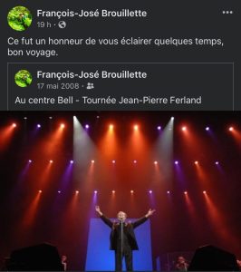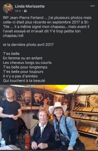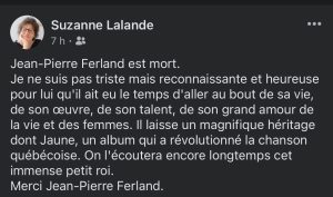 « 7h30 Un oiseau me regardait ce matin, déposé sur mon saule mature. Je pensais à Jean-Pierre Ferland, et cette solitude du départ. Il me revenait en mémoire cette soirée incroyable, à la Place des Arts, le spectacle de son Album Jaune…que de lumière, de tendresse, de mots chantés et chuchotés dans la complicité. Une vaste salle devenue toute petite, et mon chum qui me serrait la main. On a pleuré de joie. Jean-Pierre tu as vécu une merveilleuse vie, longue et heureuse, merci pour ton oeuvre, ton héritage du coeur ».