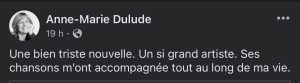 « Une bien triste nouvelle. Un si grand artiste. Ses chansons m’ont accompagnée tout au long de ma vie ».