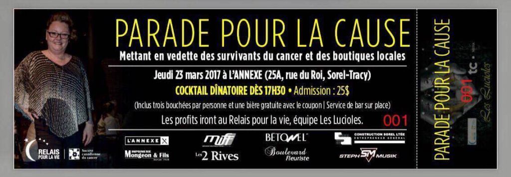 Mais j’ai aussi le bonheur de vous inviter, le 23 mars prochain, à participer à un événement spécial « Parade pour la cause ». J’animerai le défilé de mode en compagnie de mon ami Vincent Deguise. Ce sera une très belle soirée. Elle est organisée par l’équipe des Lucioles- Relais pour la vie.