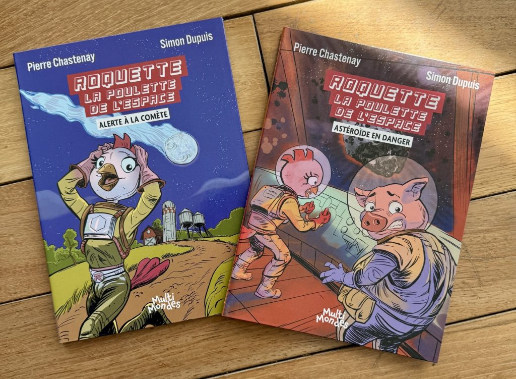 Dans cette entrevue fort sympathique, notre nouvel auteur pour enfants nous présente sa nouvelle collection Astro-Comique, où il propose deux livres mettant en vedette Roquette, la poulette de l’espace qui sont publiés chez Multi-Mondes : l’un entraîne les jeunes dans des péripéties cosmiques hilarantes à travers planètes et étoiles, et l’autre fait découvrir l’univers avec des anecdotes et des explications simples, parfaites pour éveiller la curiosité scientifique. Même à 45 ans, j’avais envie de me plonger dans ces aventures magnifiquement illustrées par Simon Dupuis.