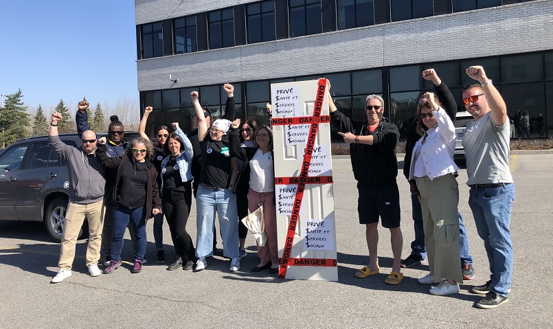 Des travailleuses et des travailleurs des secteurs privé et public se sont rendus au bureau du ministre Dubé, vendredi, pour y livrer une porte, symbolisant celle qui devrait être grande ouverte à l’expansion du réseau public et qui devrait être fermée au secteur privé.