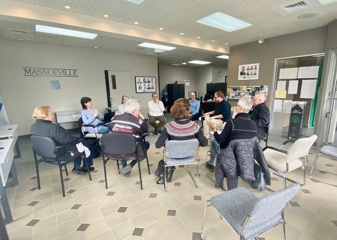 La MRC de Pierre-De Saurel conviait, dimanche dernier, à Massueville, dans le cadre de sa tournée VIVANT ICI, celles et ceux que le patrimoine régional intéresse. Peu nombreux mais démontrant un vif intérêt pour la question, les citoyens présents ont eu droit, pour lancer la discussion, aux points de vue de Denis Marion du comité local du patrimoine de Massueville et de Caroline Cloutier, agente de développement du patrimoine immobilier de la MRC de la Vallée-du-Richelieu. Le maire de Massueville Richard Gauthier :