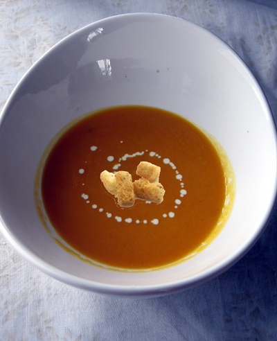 Servir avec un mince filet de crème fraîche et des croutons au parmesan.