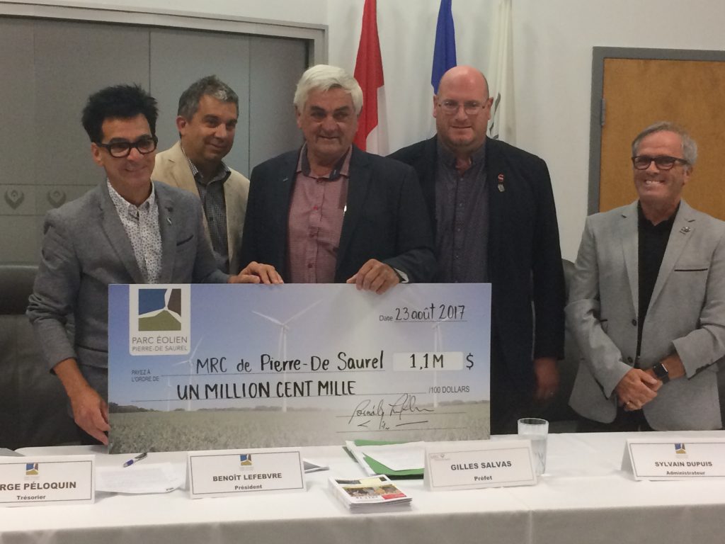 Le conseil d’administration du Parc éolien a remis hier (24 août) un premier chèque de 1,1 M de dollars à son unique actionnaire, la MRC Pierre-de-Saurel pour les 6 premiers mois d’opération du parc éolien.