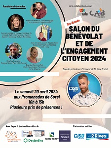 La Corporation de développement communautaire Pierre-De Saurel et le Centre d’Action bénévole du Bas-Richelieu présenteront conjointement, le samedi 20 avril, de 10h à 15h, aux Promenades de Sorel, la 1ere édition du Salon du bénévolat et de l’engagement citoyen.