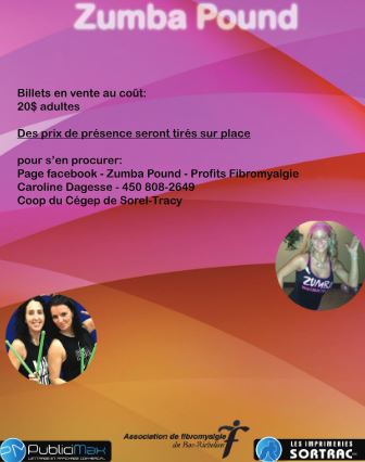 Quatre élèves du Cégep de Sorel-Tracy unissent leurs efforts et leurs talents au profit de l’Association de la fibromyalgie de Sorel-Tracy.   Elles organisent un événement de Zumba-Pound, au gymnase du collège,  le vendredi 5 avril, de 19 h à 21 h.  Les billets, au coût de 20 $,  sont en vente  à la Coop du Cégep de Sorel-Tracy et auprès de Caroline Dagesse au 450-808-2649.